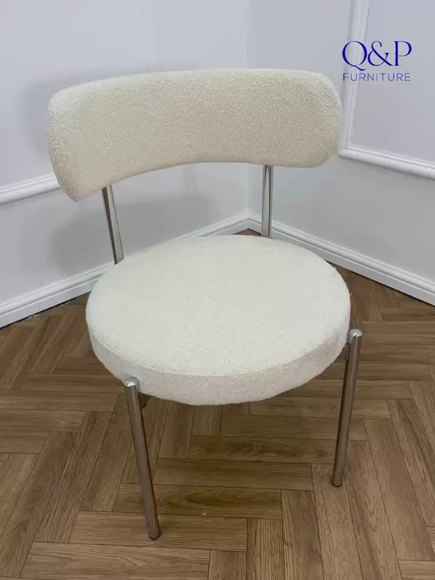 Modern accent chairs upholstered in soft teddy bear fabric, featuring elegant metal legs in gold, black, and chrome — a cosy yet stylish addition to any room.